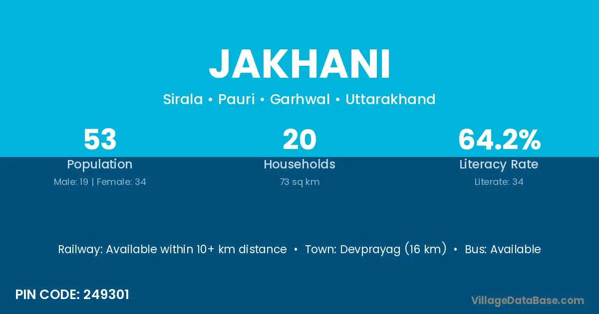 The literacy rate of Jakhani village is 77.01%. Male literacy stands at 77.78% and female literacy at 76.13%.