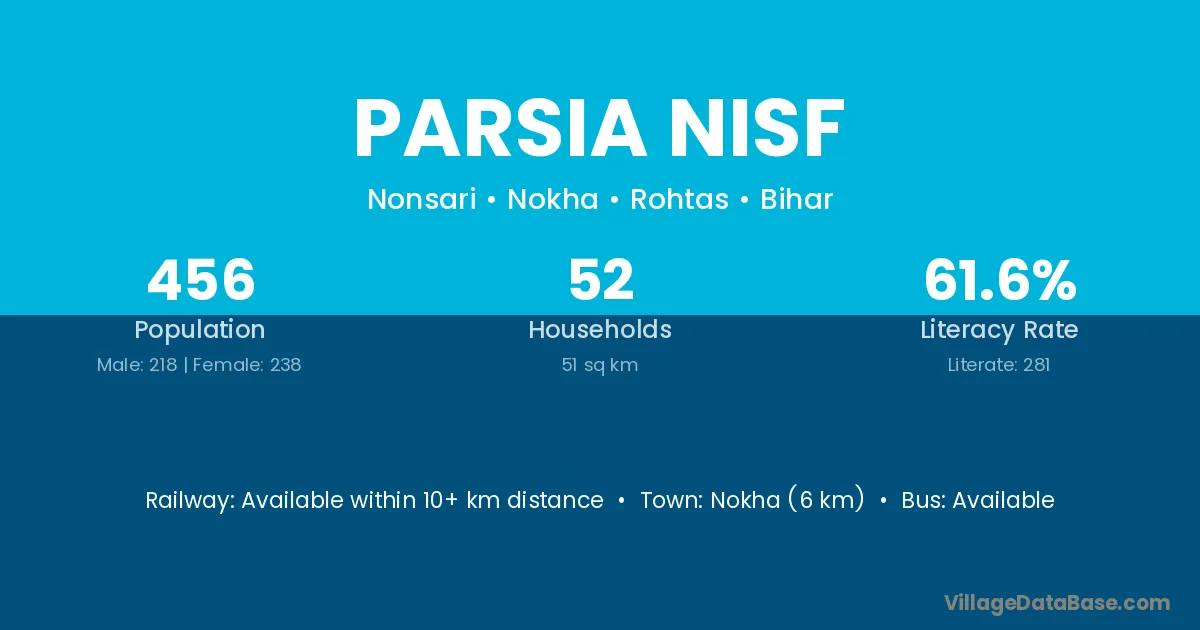 Parsia Nisf village is located in the Nokha Subdivision of the Rohtas district in Bihar .