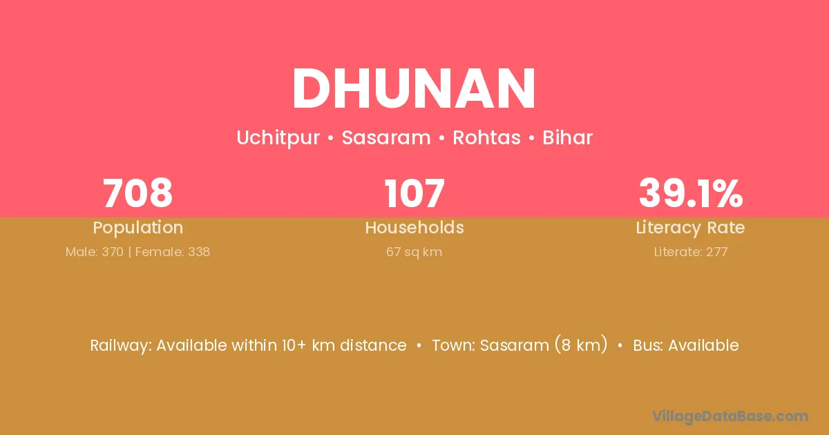 Sasaram (8 km) is the nearest town to Dhunan village for major economic activities and is located approximately 8 km away.