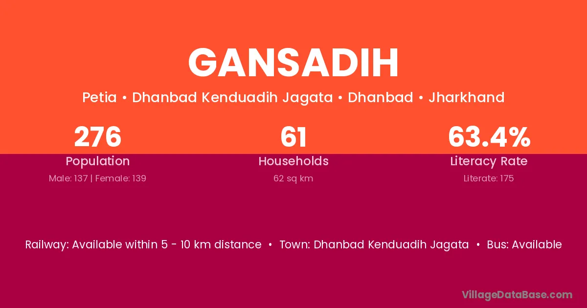 The literacy rate of Gansadih village is 60.89%. Male literacy stands at 66.69% and female literacy at 54.23%.