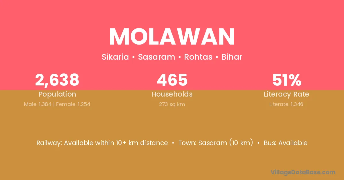 Sasaram (10 km) is the nearest town to Molawan village for major economic activities and is located approximately 10 km away.