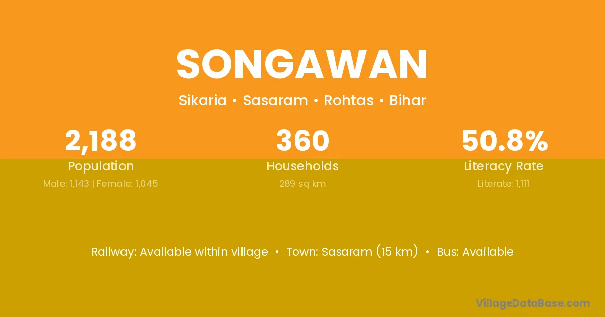 Sasaram (15 km) is the nearest town to Songawan village for major economic activities and is located approximately 15 km away.