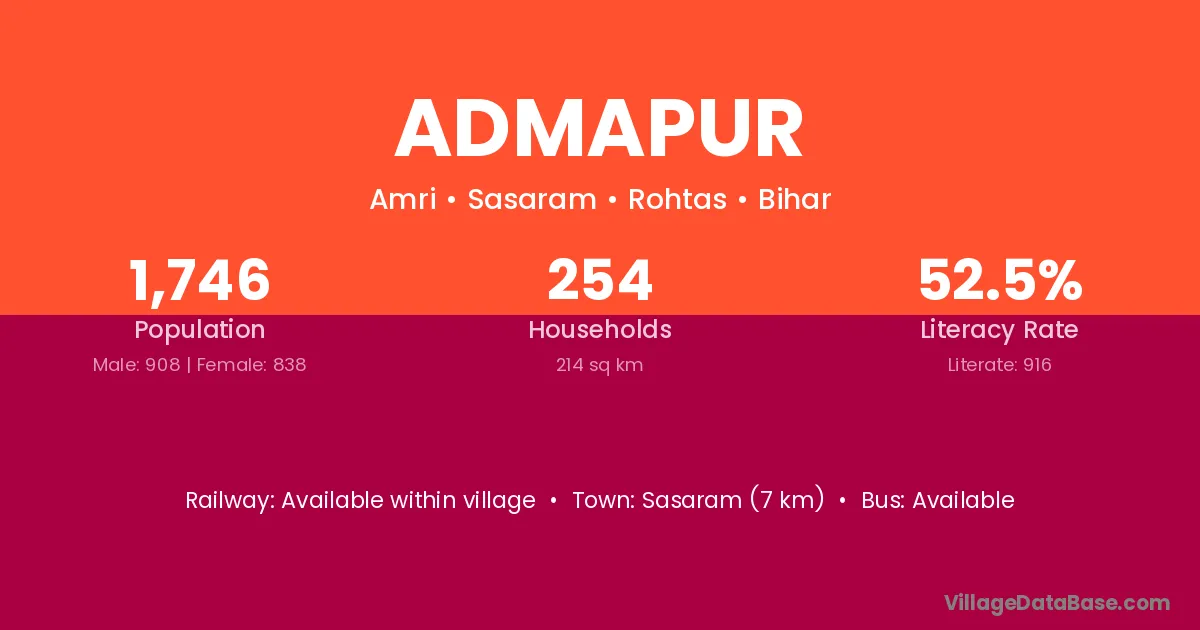 Sasaram (15 km) is the nearest town to Admapur village for major economic activities and is located approximately 15 km away.