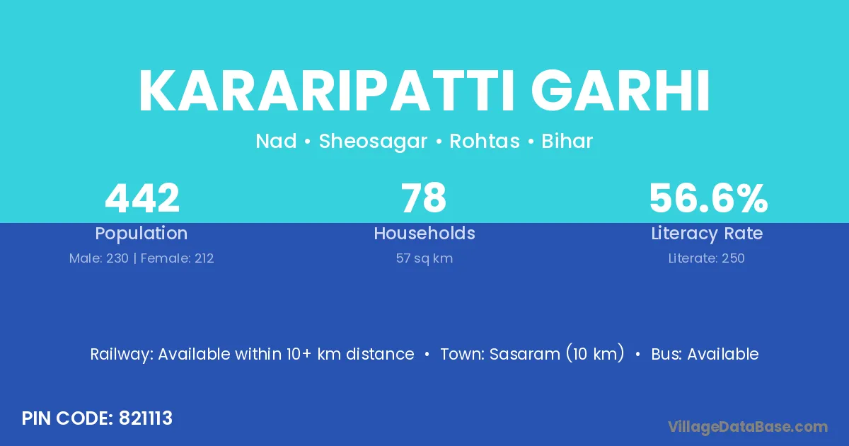 Sasaram (10 km) is the nearest town to Kararipatti Garhi village for major economic activities and is located approximately 10 km away.