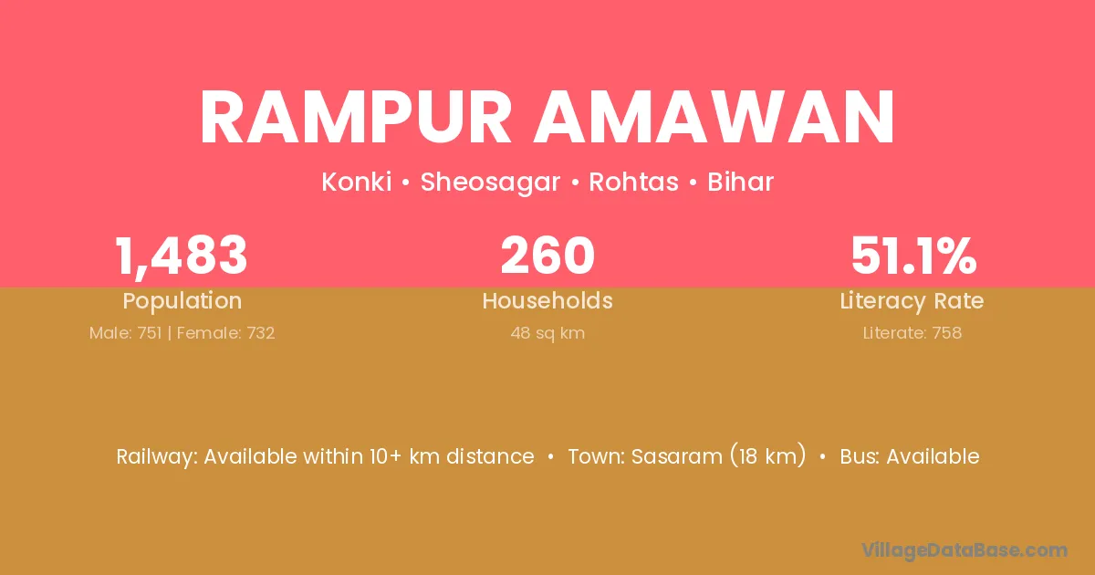 Sasaram (18 km) is the nearest town to Rampur Amawan village for major economic activities and is located approximately 18 km away.