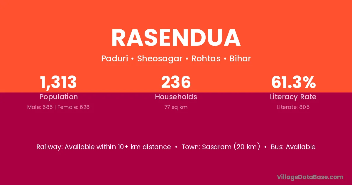 Sasaram (20 km) is the nearest town to Rasendua village for major economic activities and is located approximately 20 km away.