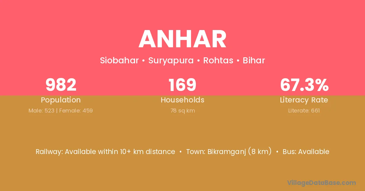 Bikramganj (8 km) is the nearest town to Anhar village for major economic activities and is located approximately 8 km away.