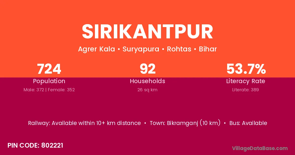 Bikramganj (10 km) is the nearest town to Sirikantpur village for major economic activities and is located approximately 10 km away.