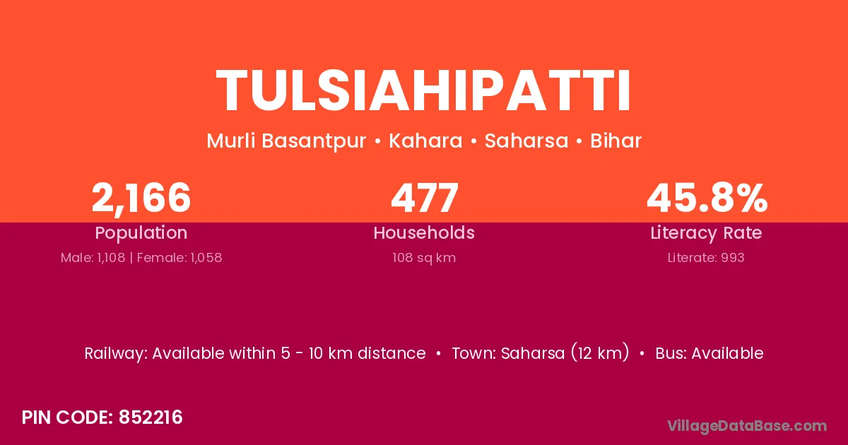 Saharsa (12 km) is the nearest town to Tulsiahipatti village for major economic activities and is located approximately 12 km away.