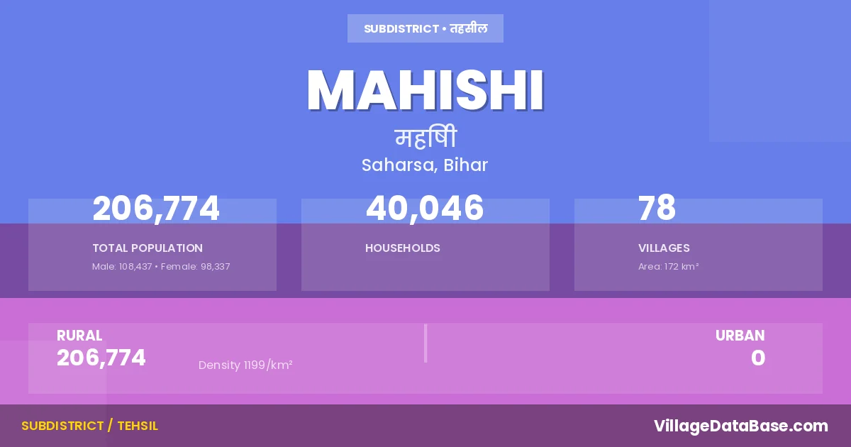 Mahishi is a town and Subdivision in the Saharsa district of the Bihar. In India, a Subdivision is a subdivision of a district responsible for the administration and revenue collection of a specific area within the district. Subdivisions play a crucial role in the local governance structure, contributing significantly to the development and administration of their communities.