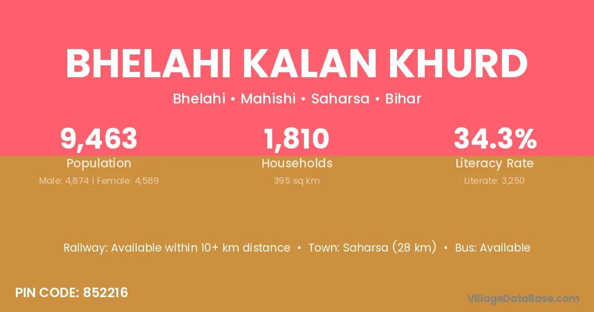 Saharsa (28 km) is the nearest town to Bhelahi Kalan Khurd village for major economic activities and is located approximately 28 km away.