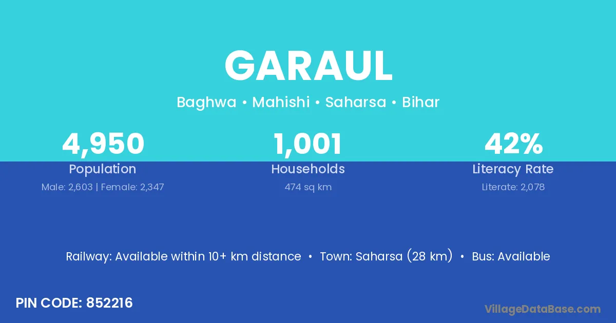 Saharsa (28 km) is the nearest town to Garaul village for major economic activities and is located approximately 28 km away.