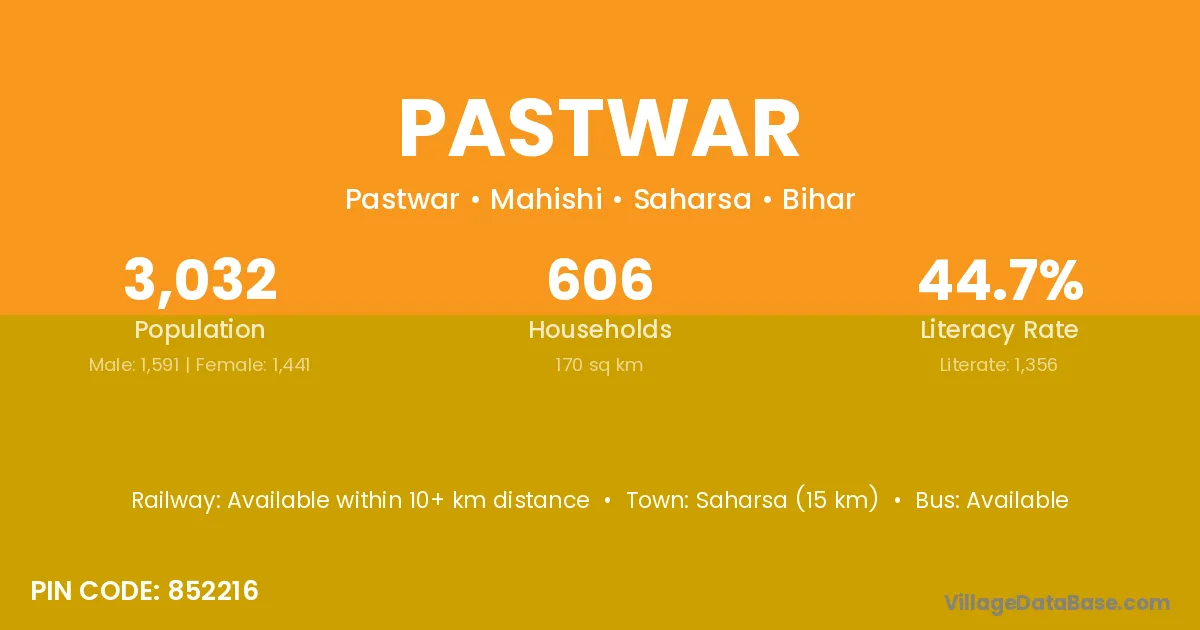 Saharsa (15 km) is the nearest town to Pastwar village for major economic activities and is located approximately 15 km away.