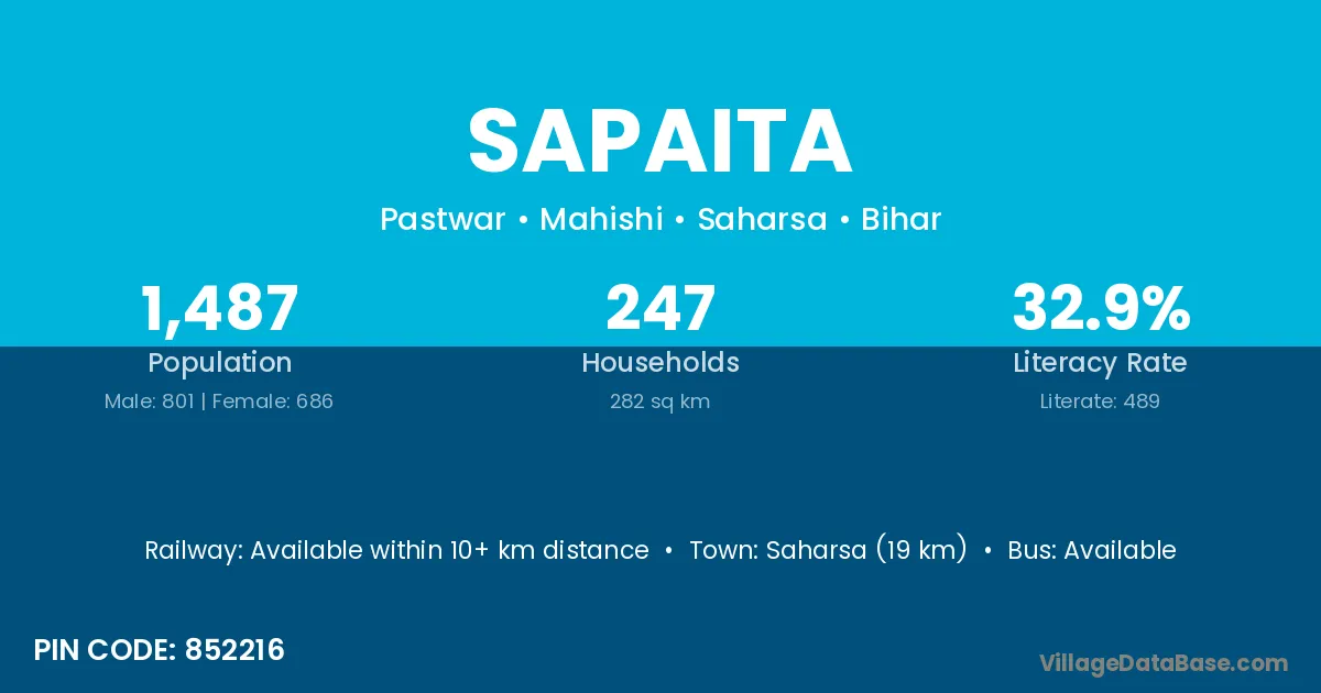 Saharsa (19 km) is the nearest town to Sapaita village for major economic activities and is located approximately 19 km away.