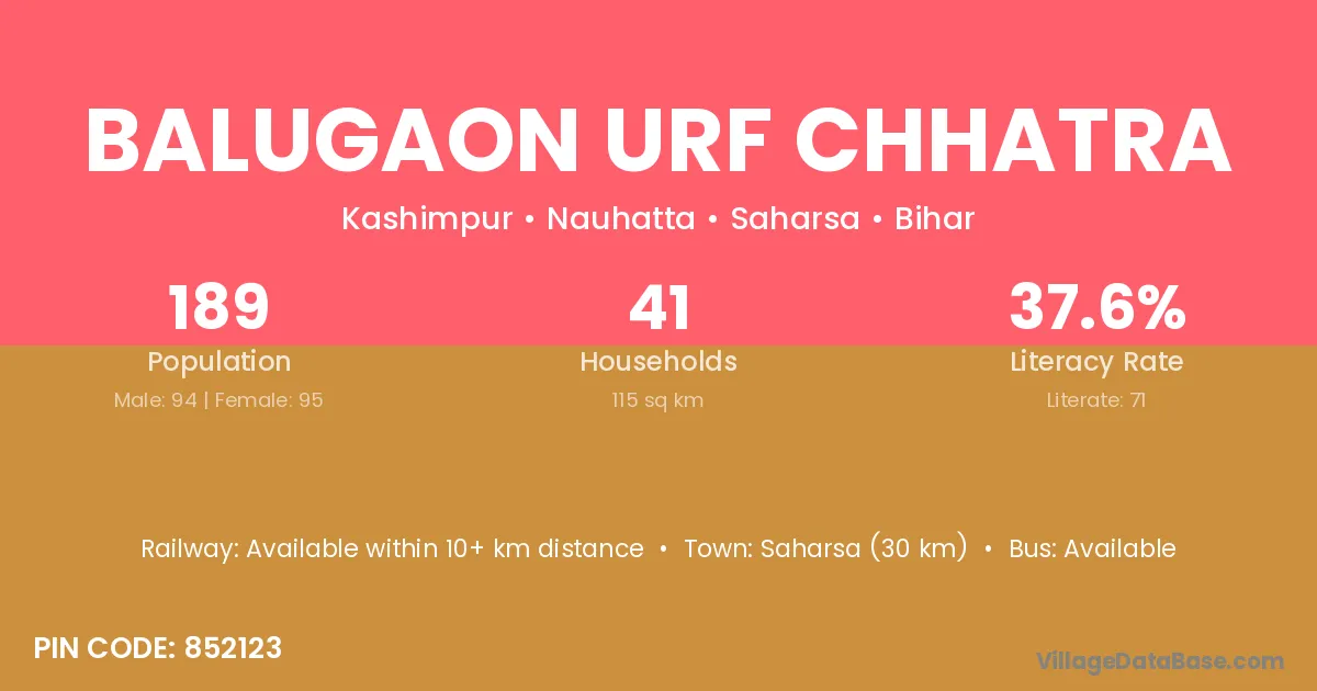 Saharsa (30 km) is the nearest town to Balugaon Urf Chhatra village for major economic activities and is located approximately 30 km away.