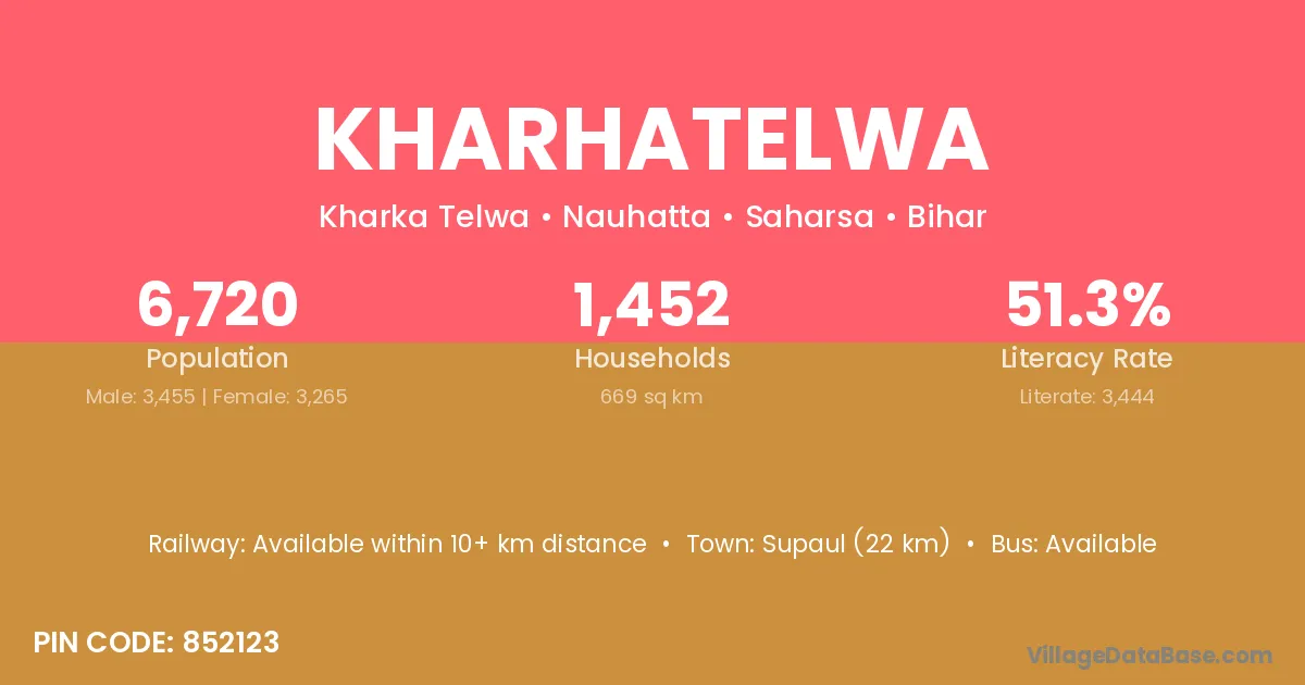 Supaul (22 km) is the nearest town to Kharhatelwa village for major economic activities and is located approximately 22 km away.