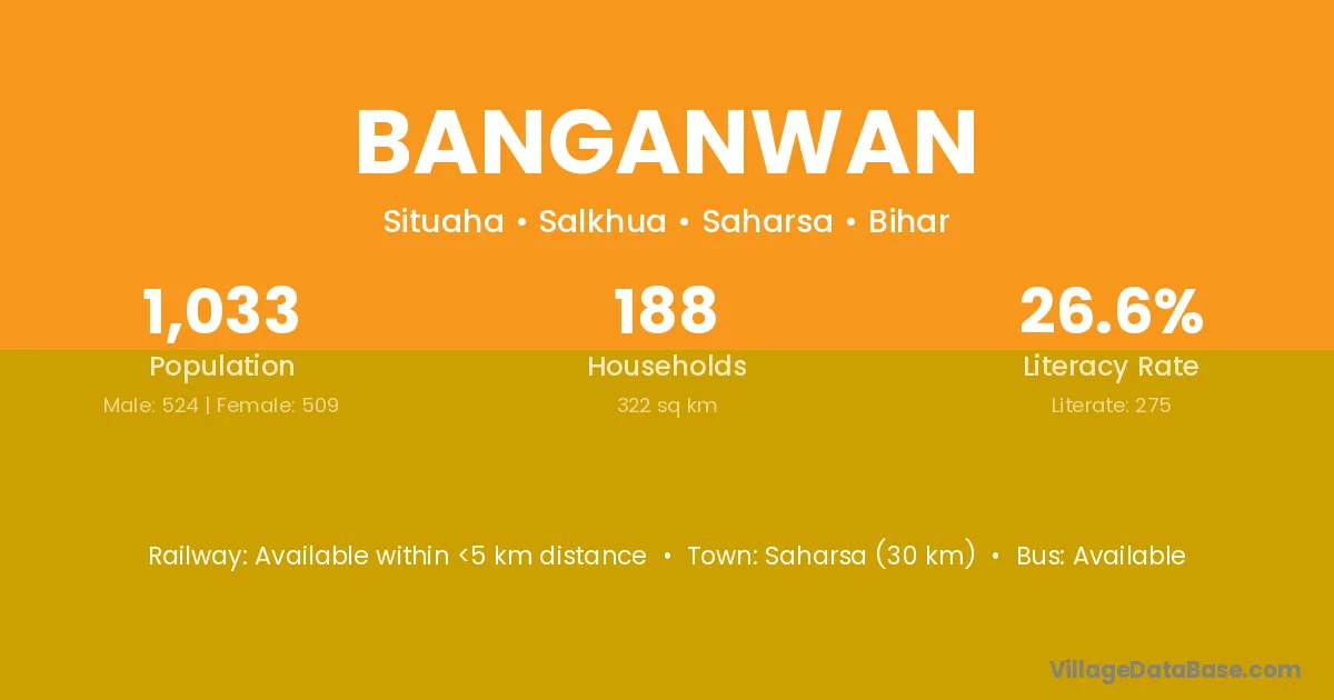 Saharsa (30 km) is the nearest town to Banganwan village for major economic activities and is located approximately 30 km away.