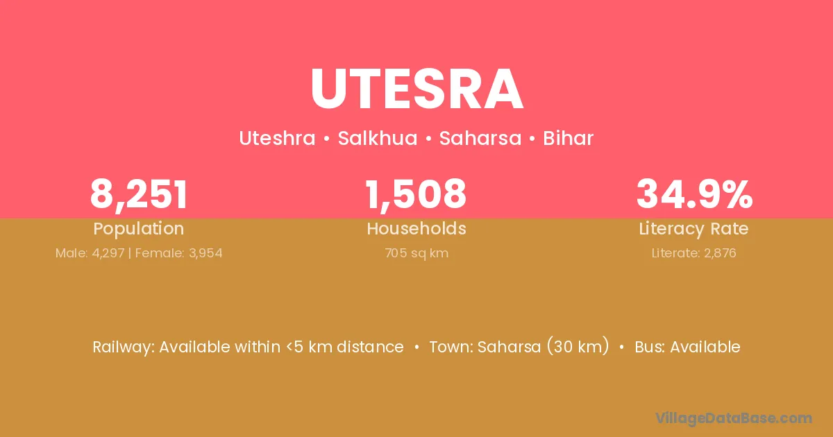 Saharsa (30 km) is the nearest town to Utesra village for major economic activities and is located approximately 30 km away.