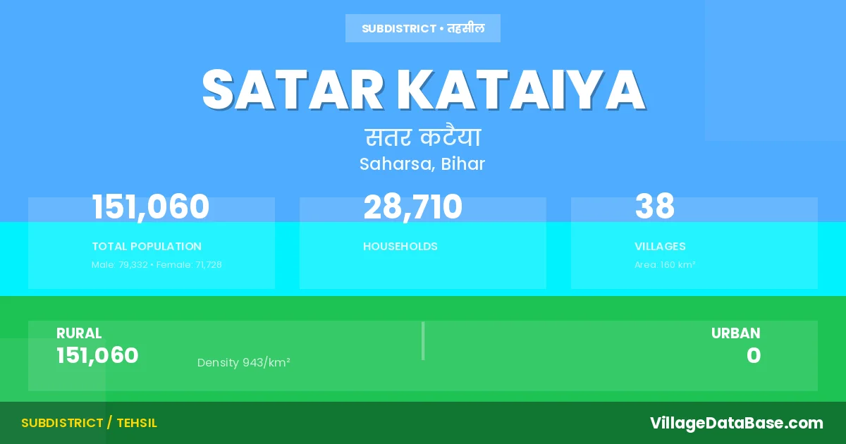 According to the 2011 census The total area of Satar Kataiya Subdivision is 160 km², with a population of 151060 people. The population density is 943 inhabitants per square kilometre, and there are approximately 28710 houses in the sub district.