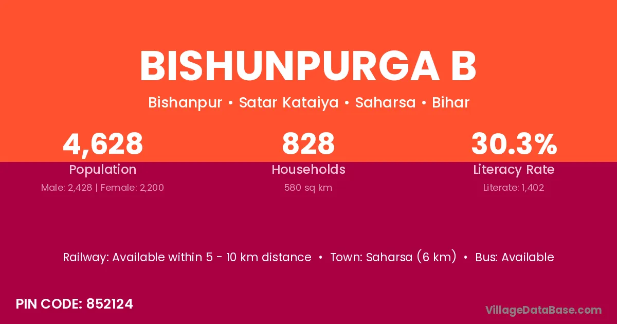 Saharsa (6 km) is the nearest town to Bishunpurga B village for major economic activities and is located approximately 6 km away.