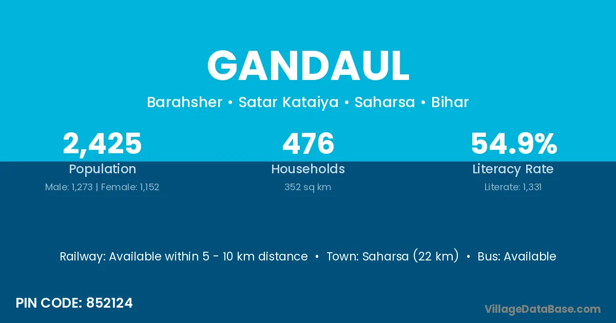 Saharsa (22 km) is the nearest town to Gandaul village for major economic activities and is located approximately 22 km away.