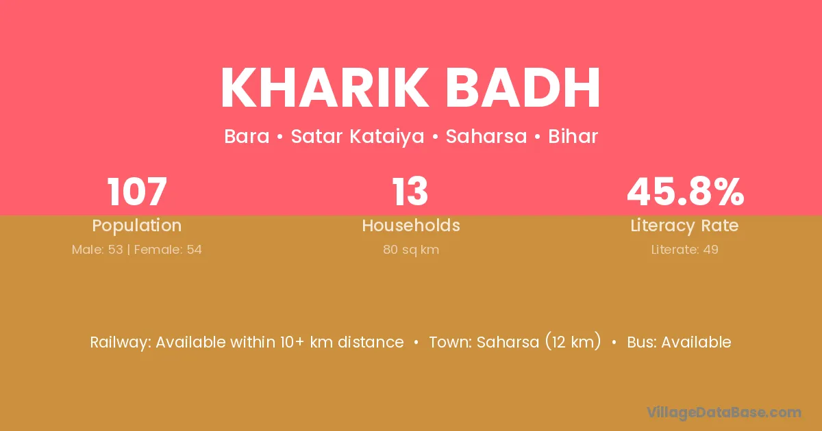 Saharsa (12 km) is the nearest town to Kharik Badh village for major economic activities and is located approximately 12 km away.
