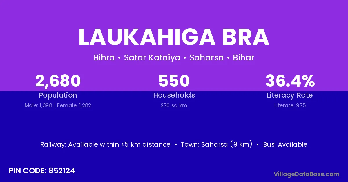 Saharsa (9 km) is the nearest town to Laukahiga Bra village for major economic activities and is located approximately 9 km away.