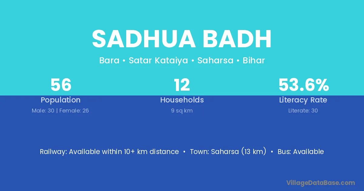 Saharsa (13 km) is the nearest town to Sadhua Badh village for major economic activities and is located approximately 13 km away.