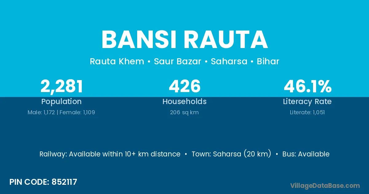 Saharsa (20 km) is the nearest town to Bansi Rauta village for major economic activities and is located approximately 20 km away.