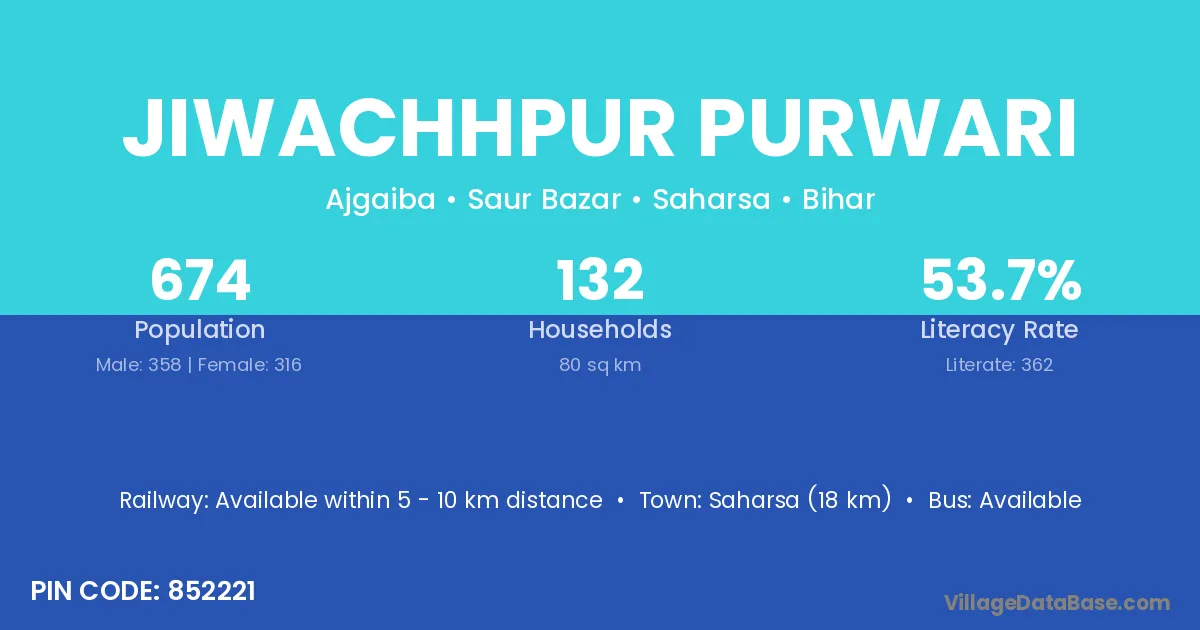 Saharsa (18 km) is the nearest town to Jiwachhpur Purwari village for major economic activities and is located approximately 18 km away.