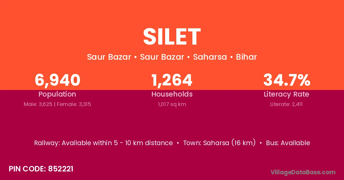 Saharsa (16 km) is the nearest town to Silet village for major economic activities and is located approximately 16 km away.