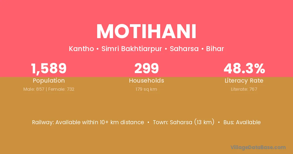Saharsa (13 km) is the nearest town to Motihani village for major economic activities and is located approximately 13 km away.