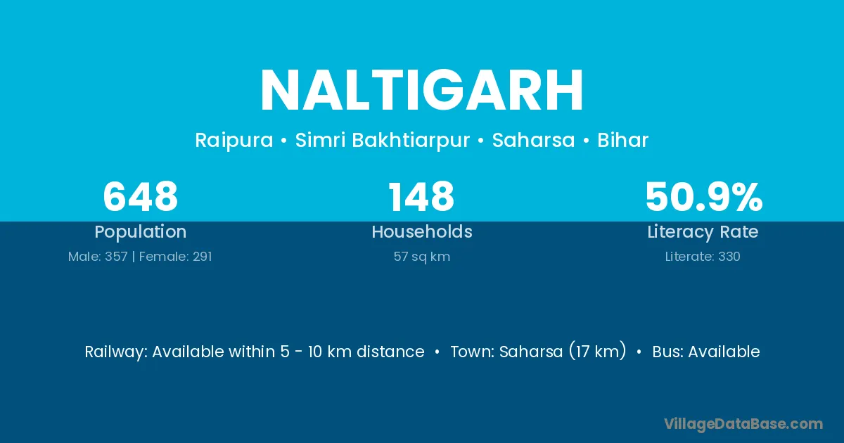 Saharsa (17 km) is the nearest town to Naltigarh village for major economic activities and is located approximately 17 km away.