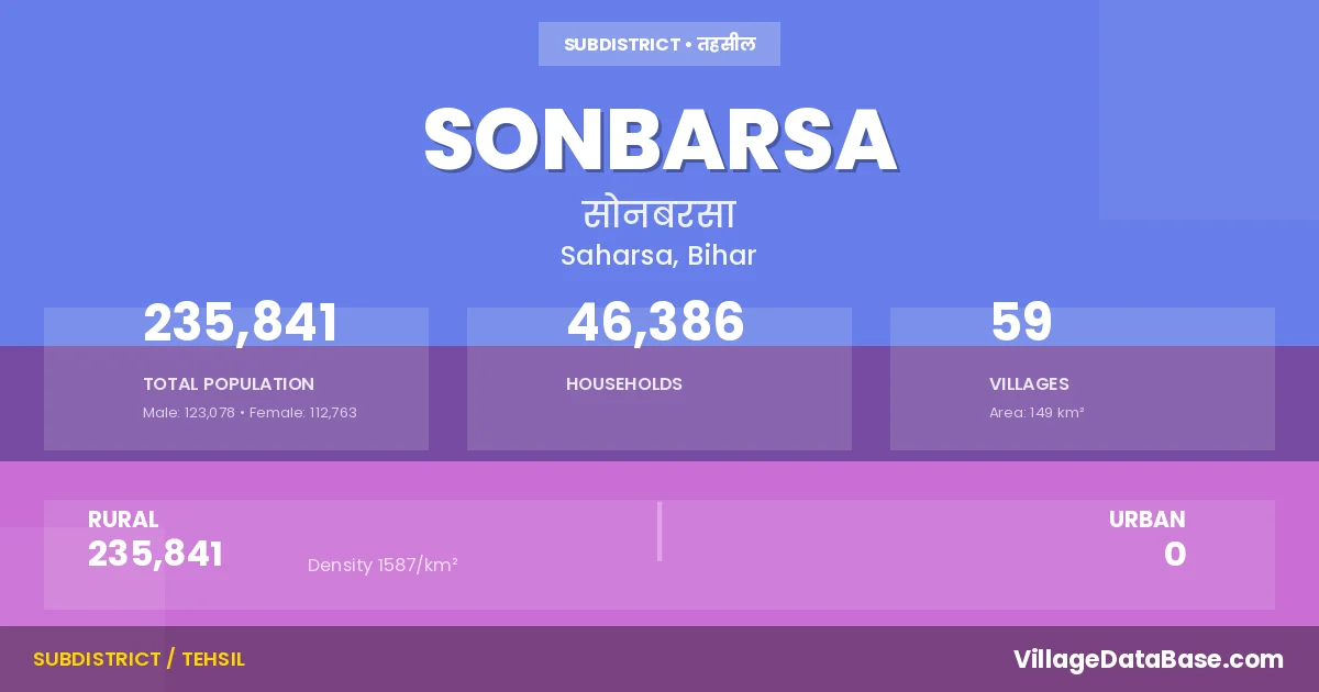 Sonbarsa is a town and Subdivision in the Saharsa district of the Bihar. In India, a Subdivision is a subdivision of a district responsible for the administration and revenue collection of a specific area within the district. Subdivisions play a crucial role in the local governance structure, contributing significantly to the development and administration of their communities.