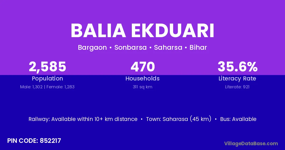 Saharasa (45 km) is the nearest town to Balia Ekduari village for major economic activities and is located approximately 45 km away.