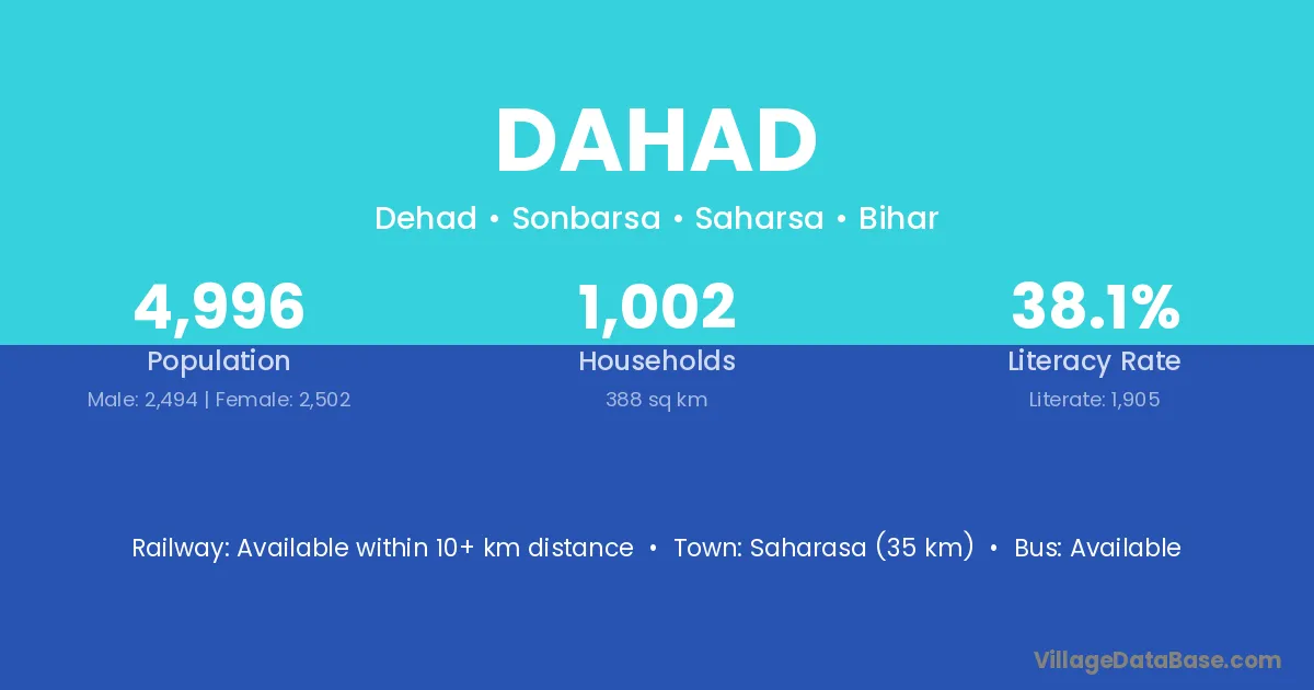 Saharasa (35 km) is the nearest town to Dahad village for major economic activities and is located approximately 35 km away.