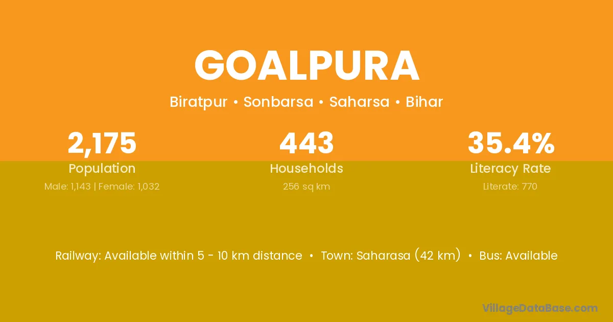 Saharasa (42 km) is the nearest town to Goalpura village for major economic activities and is located approximately 42 km away.