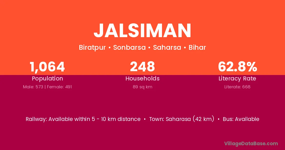 Saharasa (42 km) is the nearest town to Jalsiman village for major economic activities and is located approximately 42 km away.