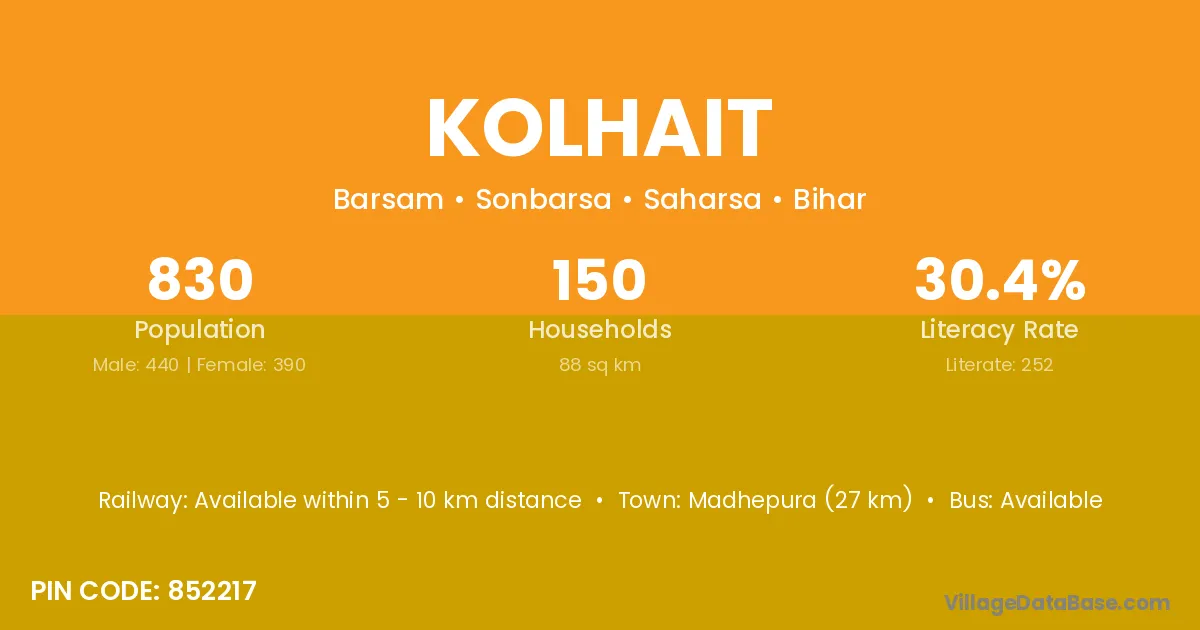 Madhepura (27 km) is the nearest town to Kolhait village for major economic activities and is located approximately 27 km away.