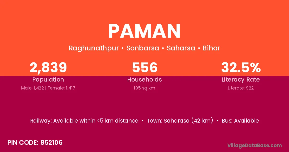 Saharasa (42 km) is the nearest town to Paman village for major economic activities and is located approximately 42 km away.