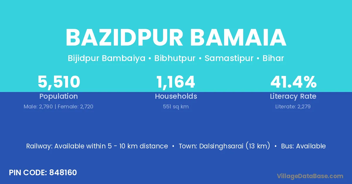 Dalsinghsarai (13 km) is the nearest town to Bazidpur Bamaia village for major economic activities and is located approximately 13 km away.