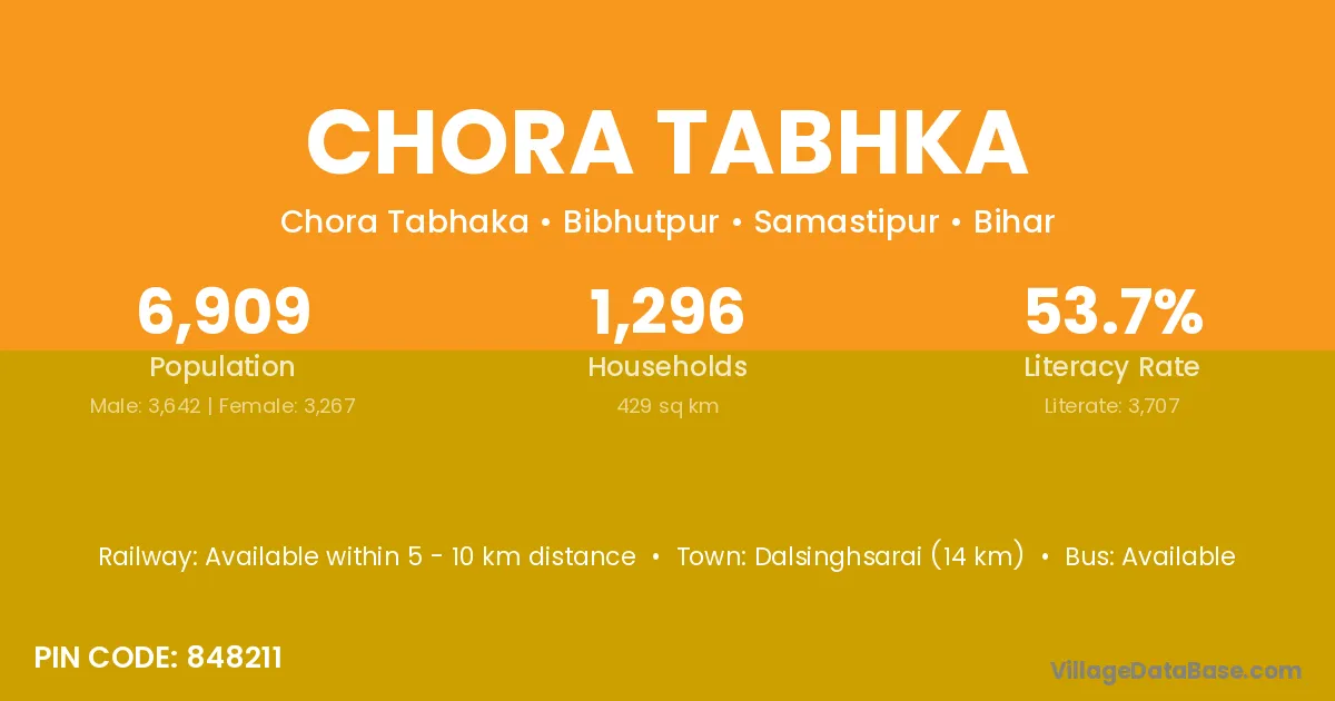 Dalsinghsarai (14 km) is the nearest town to Chora Tabhka village for major economic activities and is located approximately 14 km away.