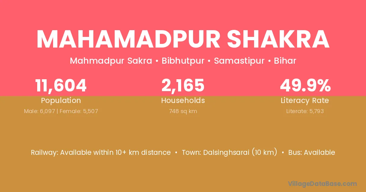Dalsinghsarai (10 km) is the nearest town to Mahamadpur Shakra village for major economic activities and is located approximately 10 km away.