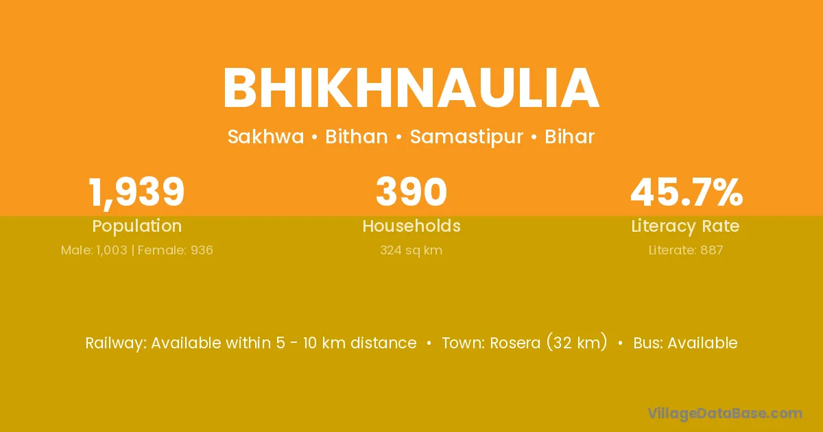 Rosera (32 km) is the nearest town to Bhikhnaulia village for major economic activities and is located approximately 32 km away.