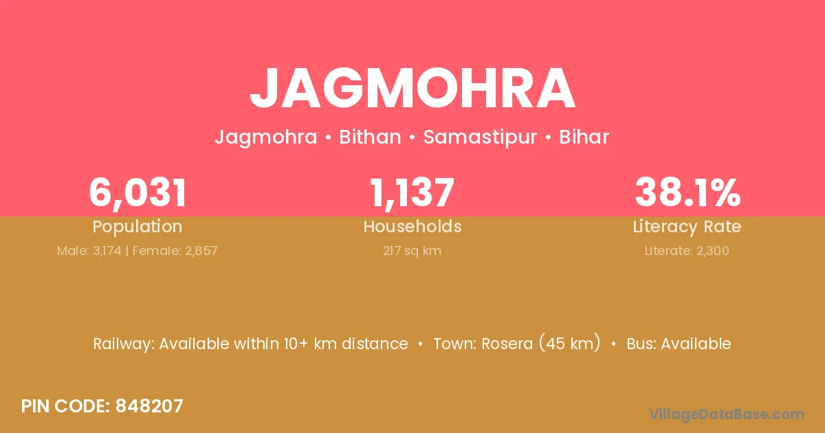 Rosera (45 km) is the nearest town to Jagmohra village for major economic activities and is located approximately 45 km away.