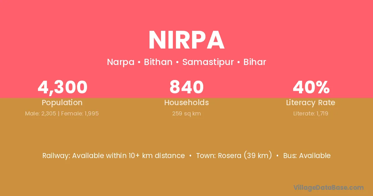 Rosera (39 km) is the nearest town to Nirpa village for major economic activities and is located approximately 39 km away.