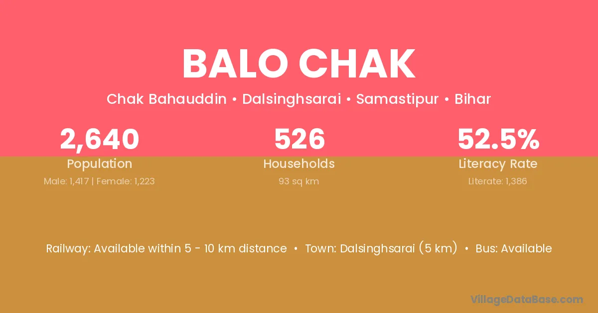 Dalsinghsarai (5 km) is the nearest town to Balo Chak village for major economic activities and is located approximately 5 km away.