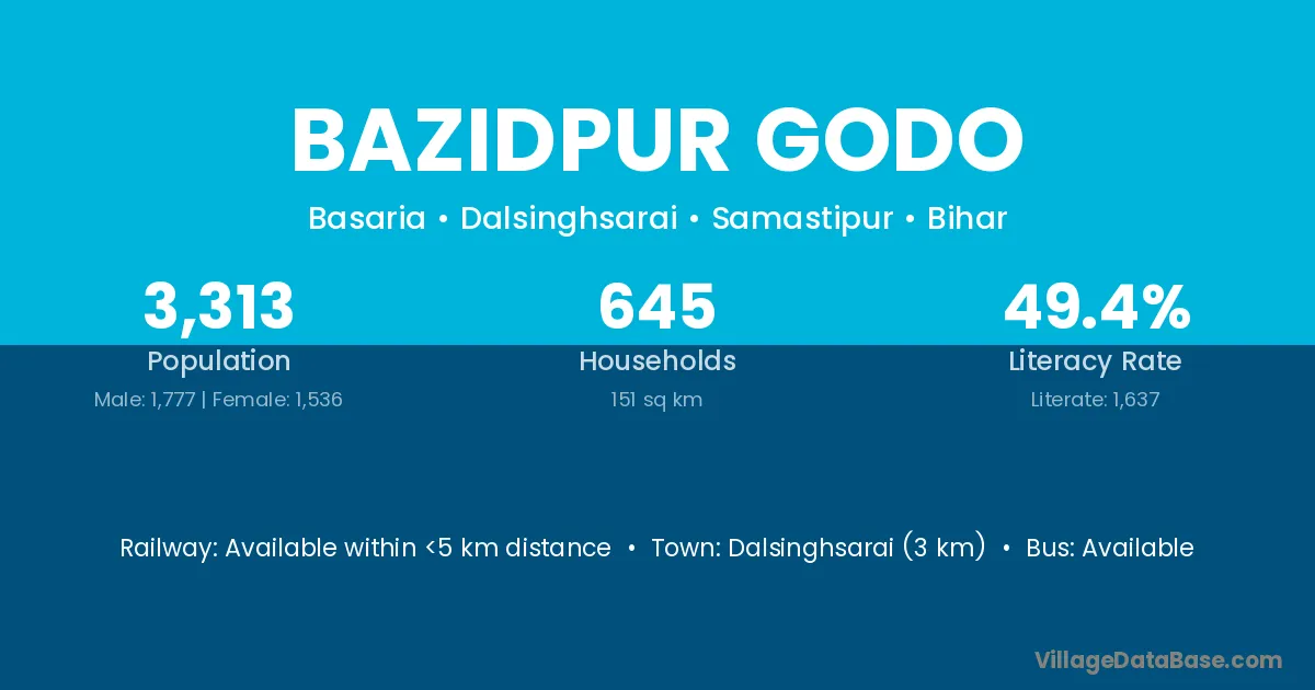 Dalsinghsarai (3 km) is the nearest town to Bazidpur Godo village for major economic activities and is located approximately 3 km away.