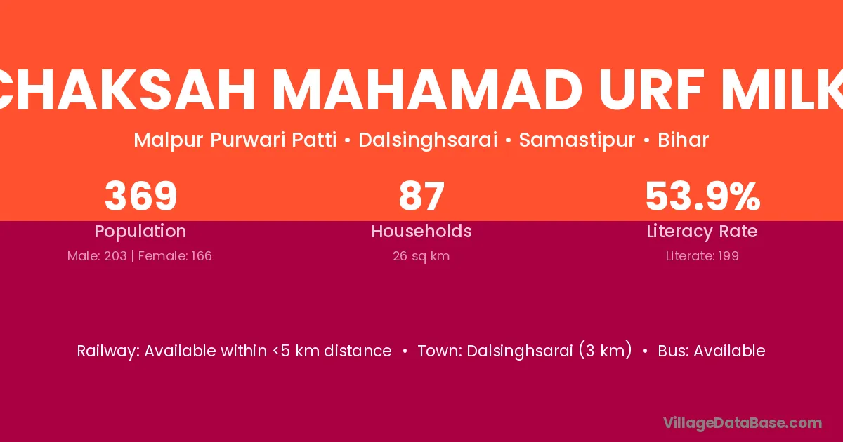 Dalsinghsarai (3 km) is the nearest town to Chaksah Mahamad Urf Milki village for major economic activities and is located approximately 3 km away.