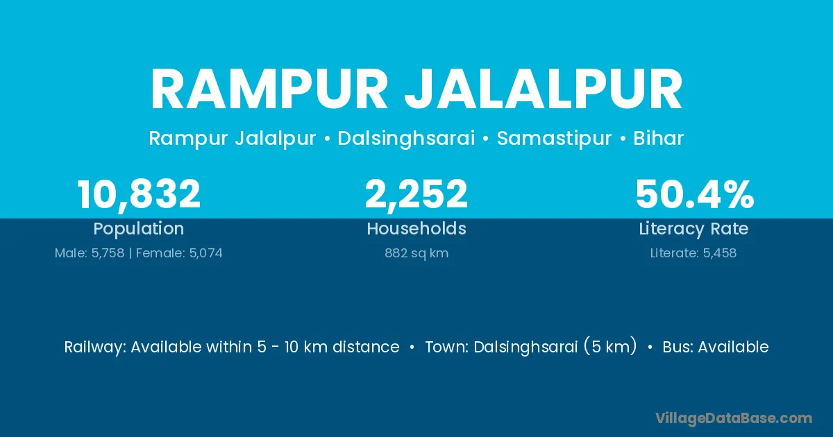Dalsinghsarai (5 km) is the nearest town to Rampur Jalalpur village for major economic activities and is located approximately 5 km away.